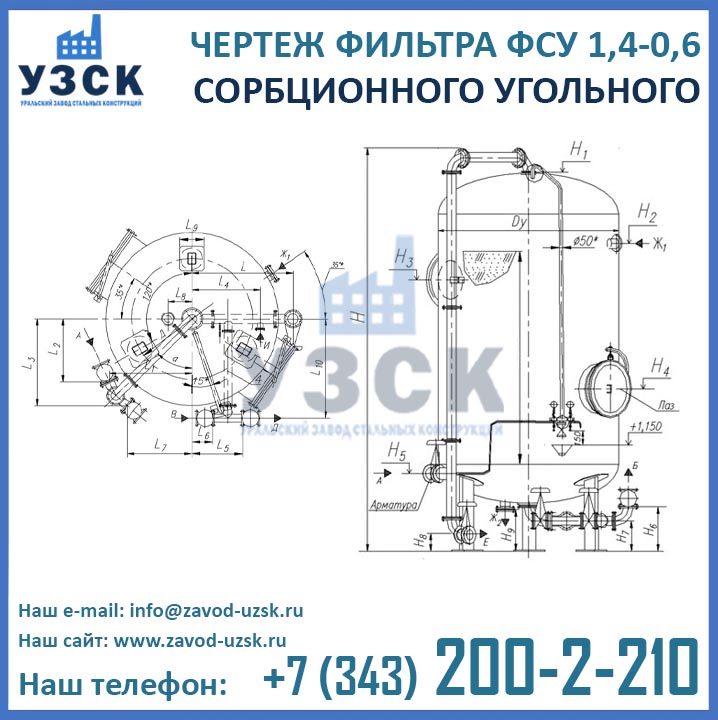 Если вы ищете фильтры ФСУ-1,4-0,6 в Подольске от изготовителя, то Вы на правильном пути! Уральский завод стальных конструкций – непосредственный производитель сорбционных фильтров ФСУ, предлагающий самые выгодные цены на ФСУ-1.4-0.6 в Подольске. По окончании процесса производства угольные фильтры проходят гидравлические испытания пробным давлением 0,9 МПа на аттестованном гидростенде, находящимся в собственности завода УЗСК. Мы гарантируем высокое качество выпускаемой продукции, и в этом уже убедились ведущие предприятия промышленного сектора России и стран ЕАЭС (см. раздел «Наши клиенты»).